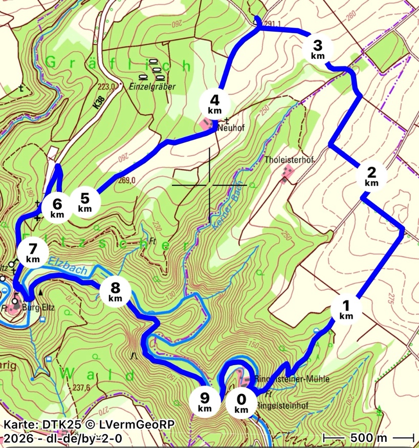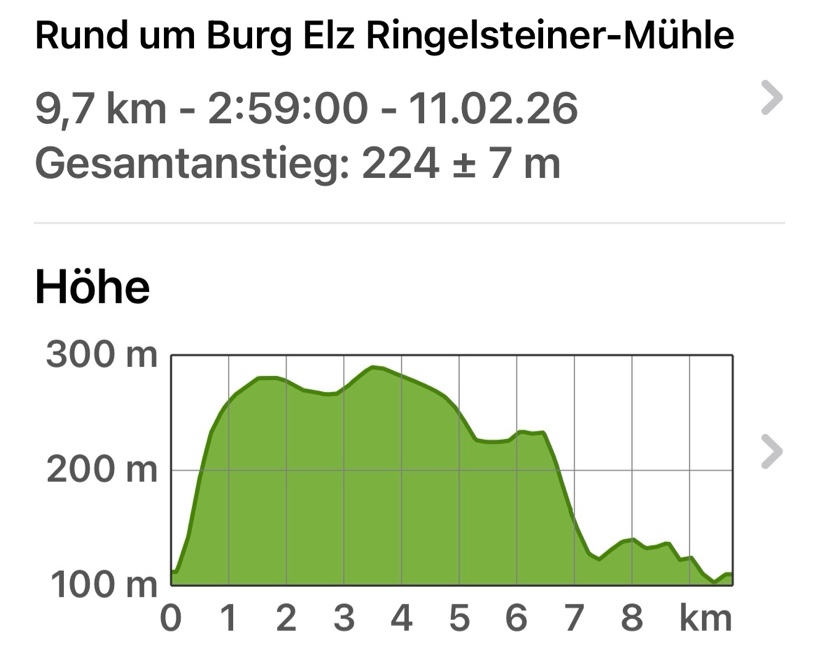 Unsere heutige Tour beginnt mit einem ca. ¾ Std. steilen Aufstieg auf die Höhe der Eifel. Oben angekommen, laufen wir über freie Flure in Richtung Wierschem mit einem fantastischen schönen Weitblick zur Eifel. Angekommen an der Wierschemer-Grillhütte tauchen wir ab zur Burg Elz und dem Bach entlang zur Ringelsteinermühle. Dort angekommen kehren wir ein, wo wir bei gutem Essen und Trinken den Tag ausklingen lassen.