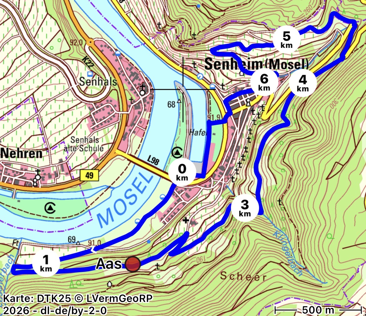 Die nächste monatliche Wanderung der zweiten Wandergruppe des Seniorenvereins findet am Mittwoch, dem 18.02.2026 statt. Wir treffen uns 10.00 Uhr am Restaurant Am Hafen in Senheim. Von hier geht es am Senheimer Hafen entlang moselaufwärts. Nach 2 km biegen in Wege ein, die durch die Weinberge bzw. durch Brachflächen führen. Uns bietet sich eine wunderbare Aussicht auf die Doppelgemeinde Senheim-Senhals, auf den Hafen mit Campingplatz, die Gemeinde Nehren und die weitläufige Moselschleife. Über gut ausgebaute Weinbergswege erreichen wir wieder unseren Ausgangspunkt. In gemütlicher Runde wollen wir bei Essen und Getränken unseren Wandertag ausklingen lassen.