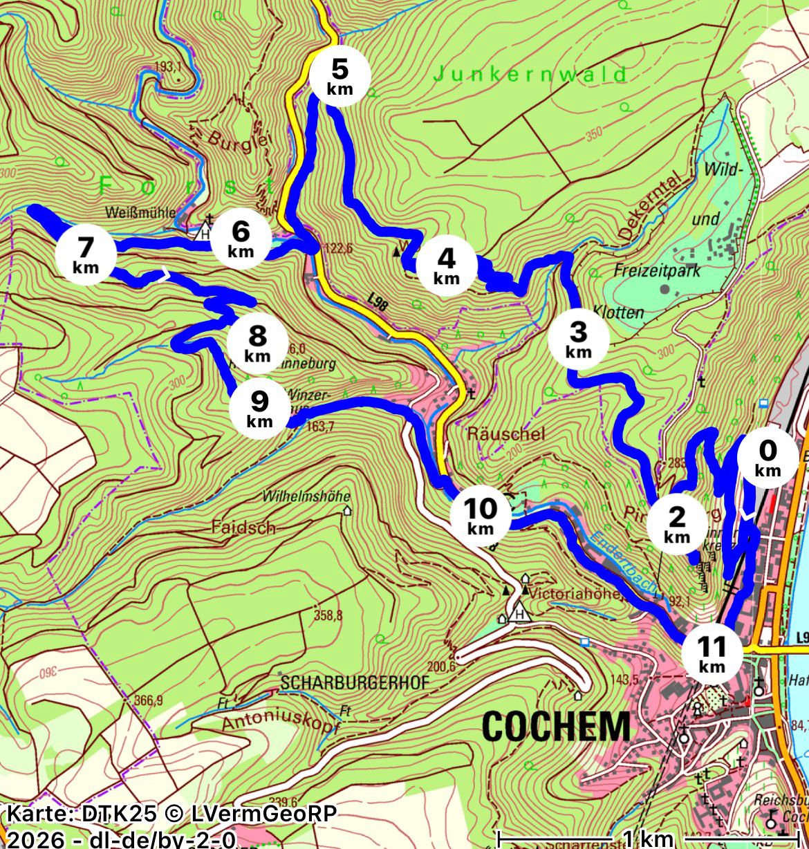 Die nächste Wanderung der 4.Gruppe ist am Dienstag den 21.April 2026, Treffpunkt 09:30 Uhr Parkplatz am Bahnhof Cochem. Über Serpentinen erreichen wir den Aussichtpunkt Pinnerkreuz mit grandiosem Blick ins Moseltal (ca. 150 HM, alternativ Sesselbahn). Nach einer Rast geht es weiter zur Wackelei von wo aus man einen tollen Blick auf die Mosel mit der Stadt Cochem, die Reichsburg und Ruine Winneburg sowie in die Eifel hat. Nach den tollen Eindrücken erreichen wir über einen Pfad das Enderttal und wandern über einen breiten Weg zur Ruine Winneburg. Über einen Pfad geht es zurück nach Cochem ins Restaurant Karl Müller wo wir uns nach der anspruchsvollen Tour mit Essen und Getränken stärken.